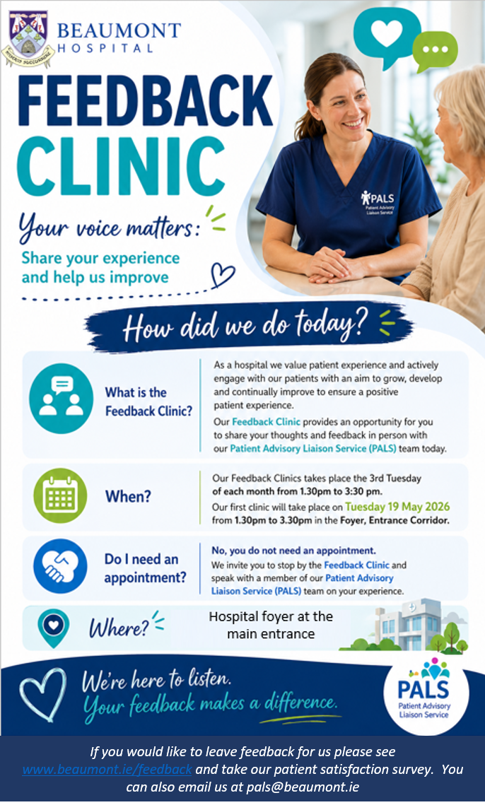 Beaumont are launching a Patient Feedback Clinic which will take place on the 3rd Tuesday of each month from 1.30pm to 3.30pm in the main foyer of the Hospital. Our first clinic will be on Tuesday 19 May. Please drop by if you are in with us that day and share your feedback with us. If you cant visit us in person you are more than welcome to leave feedback HERE for us or take our patient satisfaction survey. You can also email us at pals@beaumont.ie. We value your input as a patient or family member to help us improve our services and ensure a positive outcome for our patients.